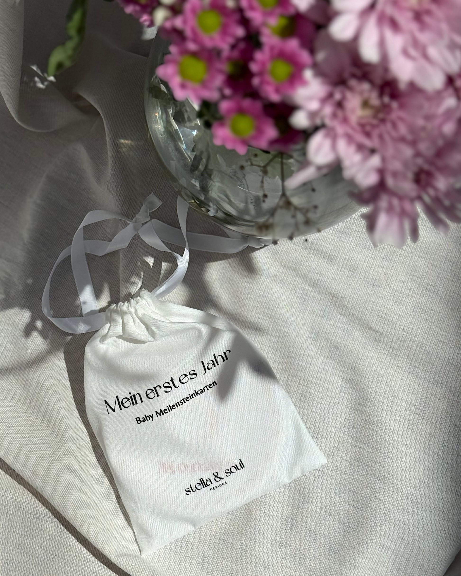Im hochwertigen Leinensäckchen verpackt, sind die Meilensteinkarten ein liebevolles Geschenk für frischgebackene Eltern – ideal zur Babyparty, zur Geburt oder zur Schwangerschaft.