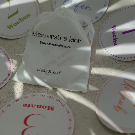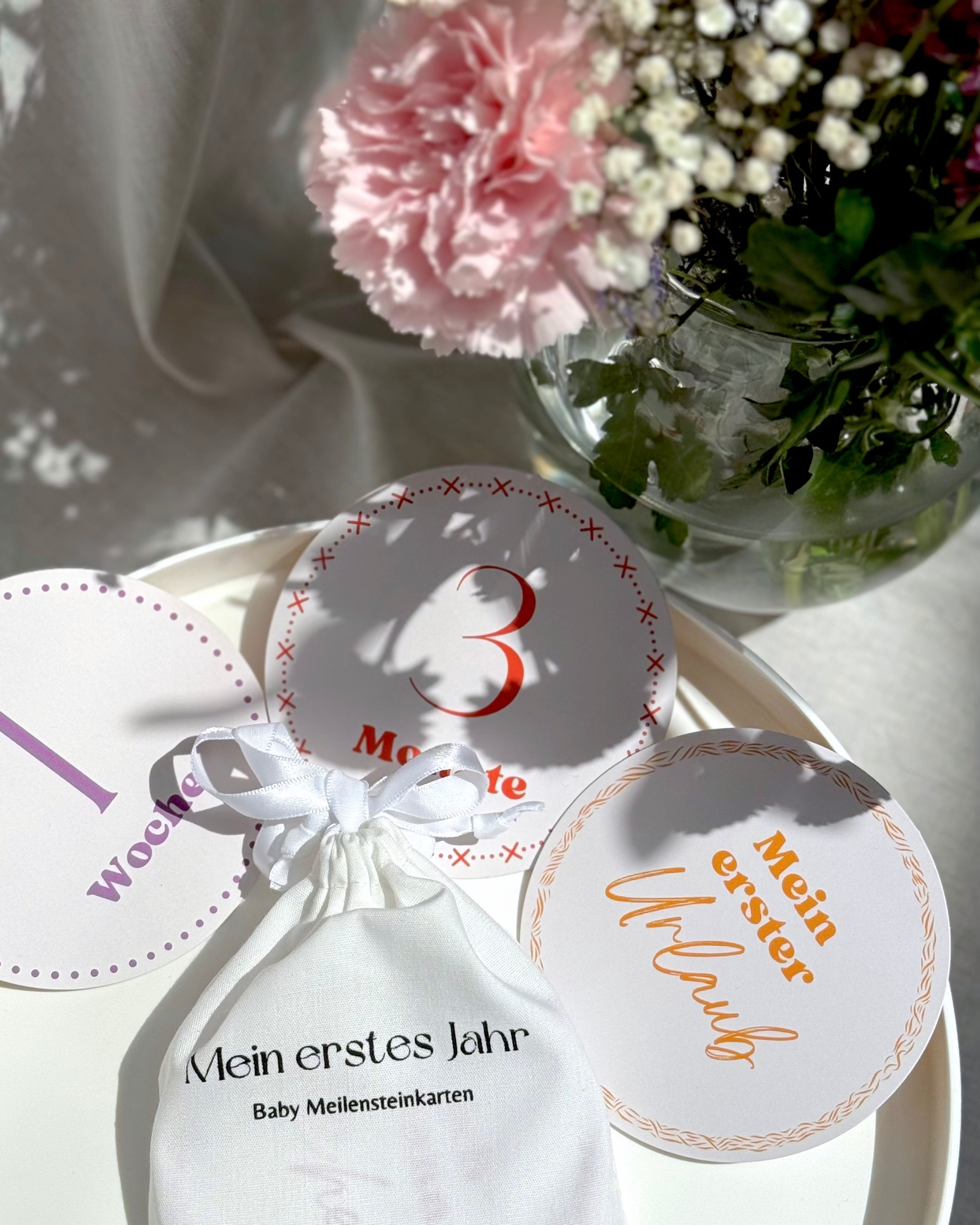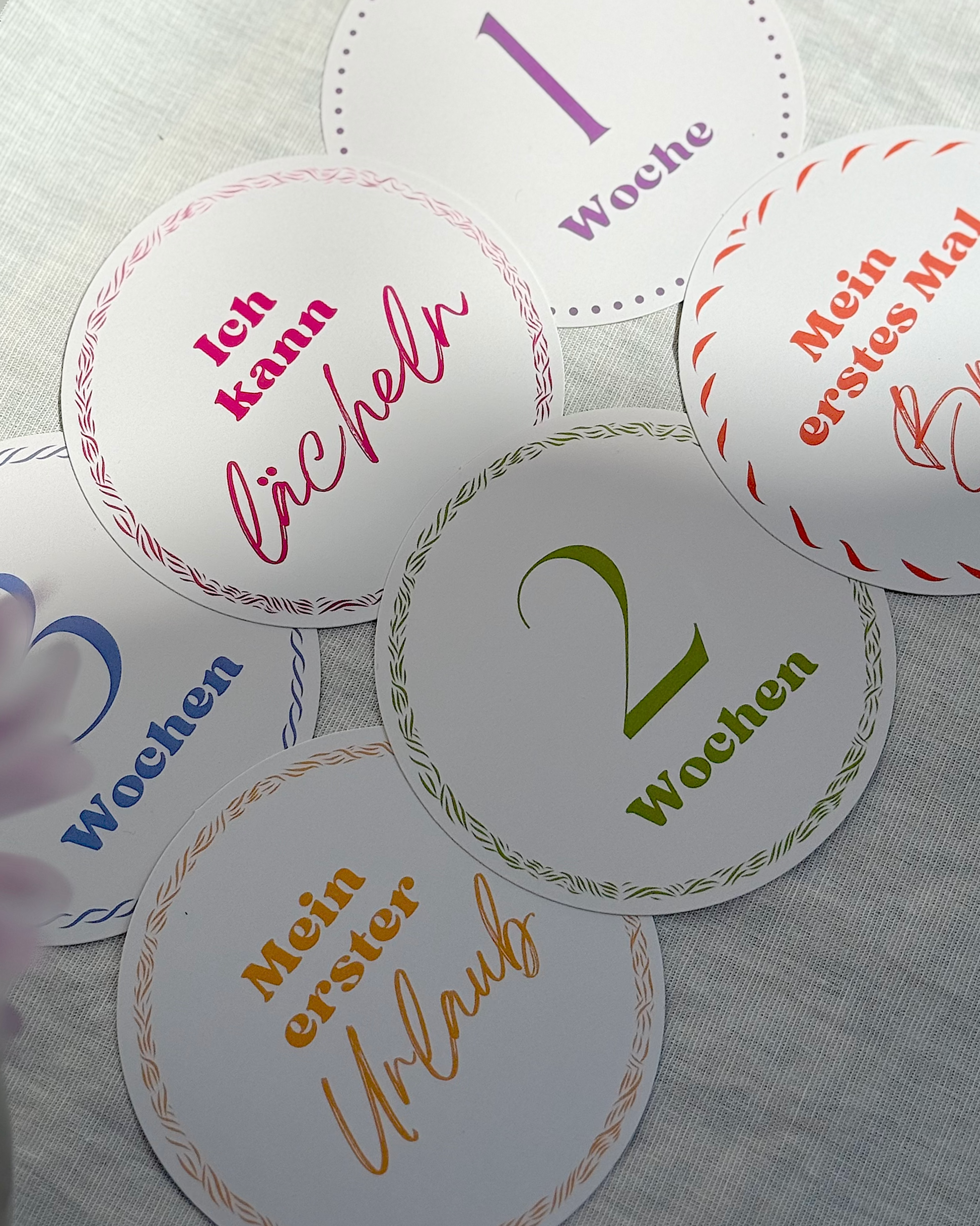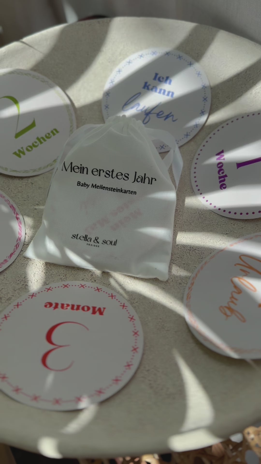 Mit dem liebevoll gestalteten Set aus 35 runden Karten kannst du die schönsten Momente dokumentieren: Von den ersten kleinen Meilensteinen wie Lächeln und Umdrehen bis hin zu den monatlichen Alterskarten.
